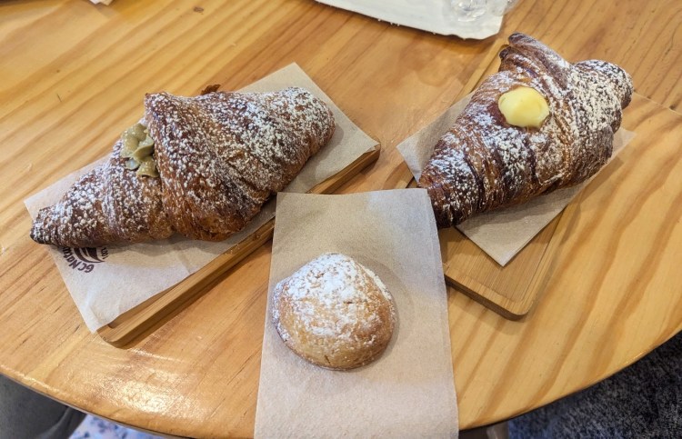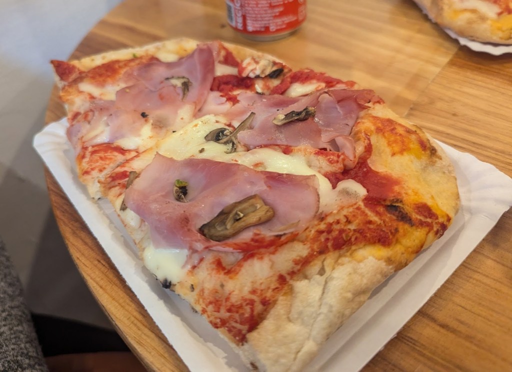 Cada fatia de pizza (ou melhor cada quadrado) ficou entre 6.5 a 9 euros, dependendo do tipo de pizza. Acabámos por não resistir e também experimentámos os croissants – um recheado com creme de baunilha e outro com creme de pistachio. Ambos eram uma delícia e muito baratos – cada croissant custou 1.5 euros.