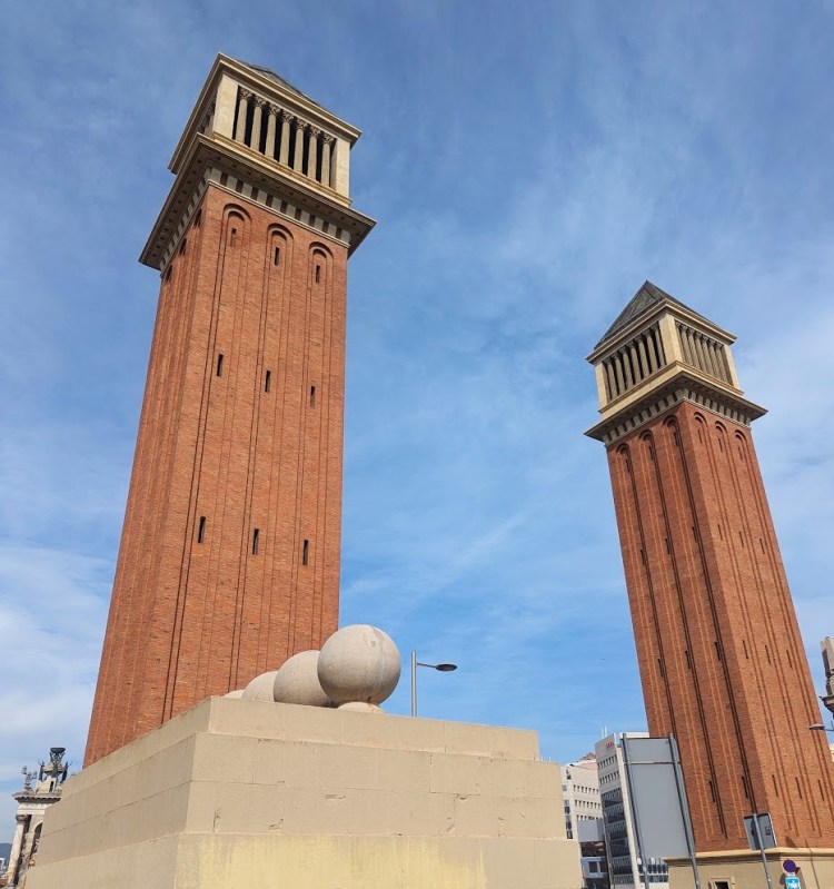 Quando chegámos a este local o primeiro monumento que vimos foram as Torres Venezianas. Estas duas torres são símbolos icónicos da cidade fazendo parte do legado deixado pela exposição de 1929. Aliás estas duas torres foram instaladas para servirem de entrada à Exposição Universal. As duas torres simétricas foram construídas entre 1927 e 1928 com base na torre do Campanário de São Marcos em Veneza e por isso o seu nome, Torres Venezianas. Apesar de a torre de Veneza ter maiores dimensões, estas duas torres não deixam ninguém indiferente. A parte engraçada é que estas torres quando foram construídas eram para ser temporárias, ou seja, depois da exposição eram para ser demolidas. E por isso os materiais usados na sua construção não foram os de melhor qualidade. Como depois da exposição decidiu-se em manter as torres tem desde então havido um trabalho imenso de manutenção para compensar a falta de qualidade dos materiais.